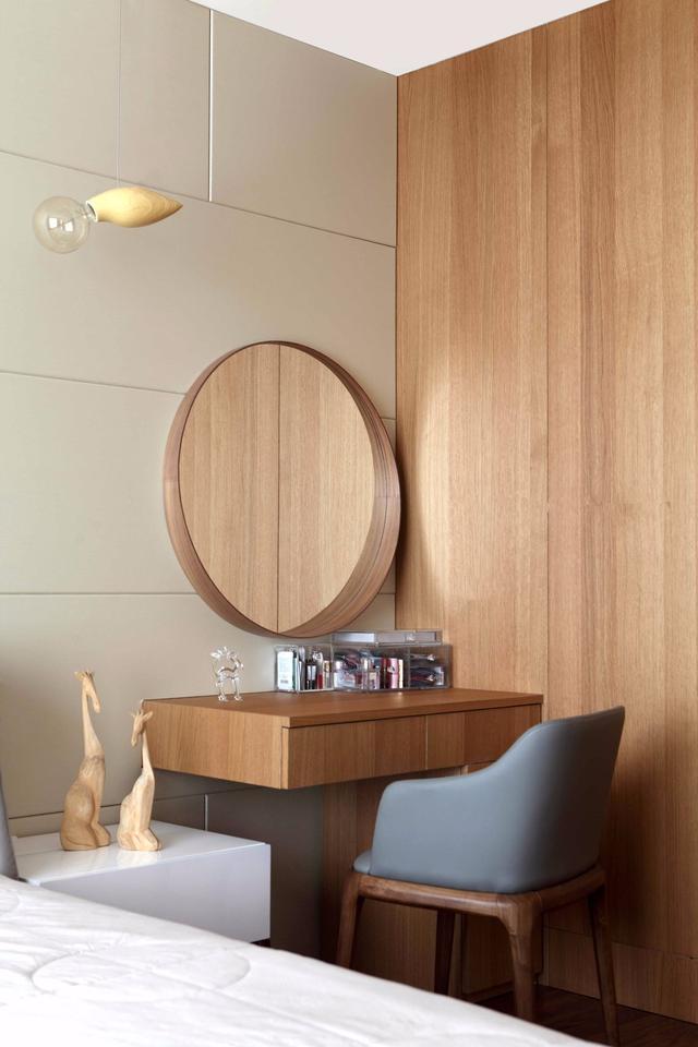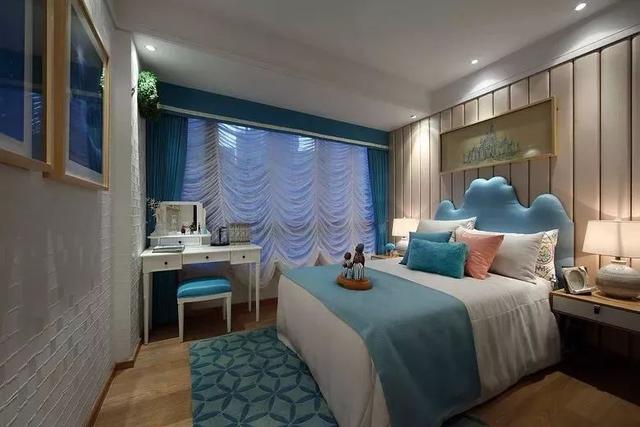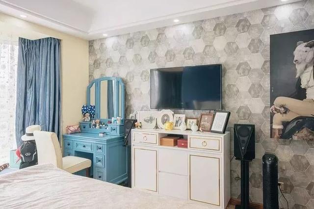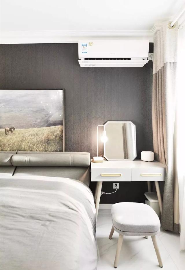對于臥室面積較小,然后又想放兩個床頭柜的業(yè)主,不妨可以把梳妝臺放在電視墻,與電視柜平齊排放;