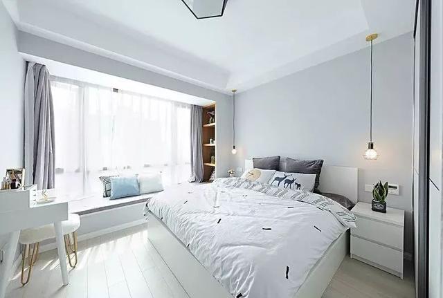 對于面積稍大的臥室,除了擺放床,床頭柜之外,可以把其中一個床頭柜撤掉,放梳妝臺,倘若面積足夠大的,仍然可以保留床頭柜;